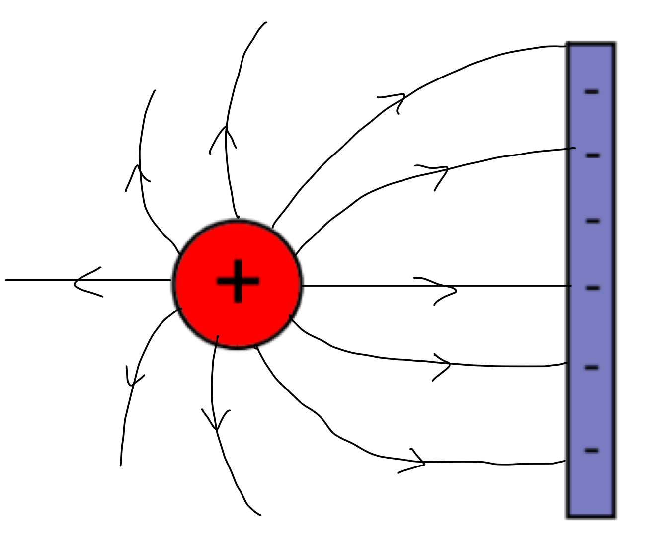Draw a diagram showing the electric field between a positive sphere and a negative bar