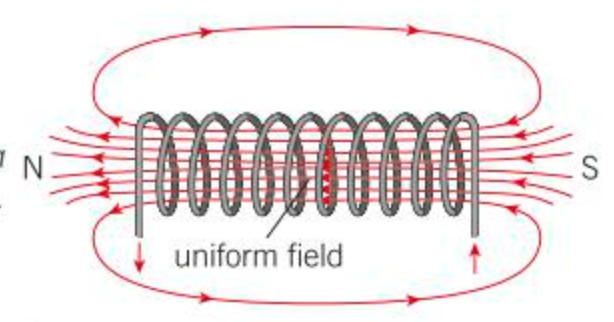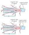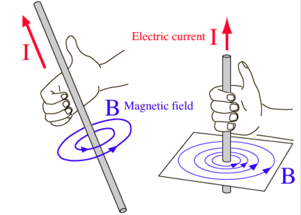The direction of a magnetic field around a current carrying wire can be calculated using the right hand grip rule. Imagine your thumb represents the direction of the current, your curved fingers will give the direction of the field lines