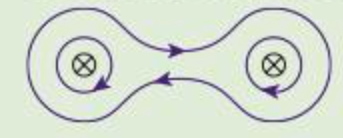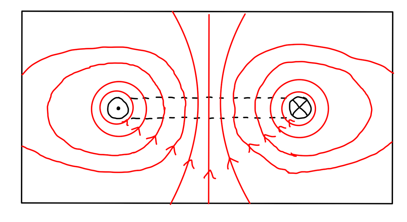 Sketch the magnetic field pattern around these 2 current carrying wires