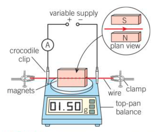 The magnetic field between the magnets is almost uniform. When a current is passed through the wire, the wire experiences a force and according to newtons third law of motion the magents experience an equal and opposite force. This force can be determined by finding the change in the mass reading and using F = mg. B can then be determined by B = F/(ILsin90)