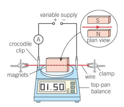 Place two magnetic poles at 90º to a current carrying wire over an electronic balance