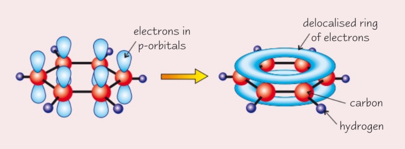 The electrons in the rings are delocalised (don’t belong to specific carbon atom)