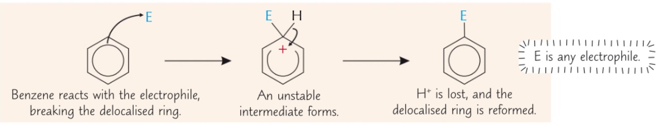 This means that benzene prefers to react by electrophilic substitution