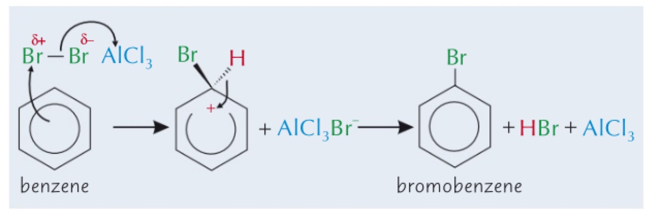 Benzene will react with halogens (e.g. Br2) in the presence of an aluminium chloride catalyst, AlCl3