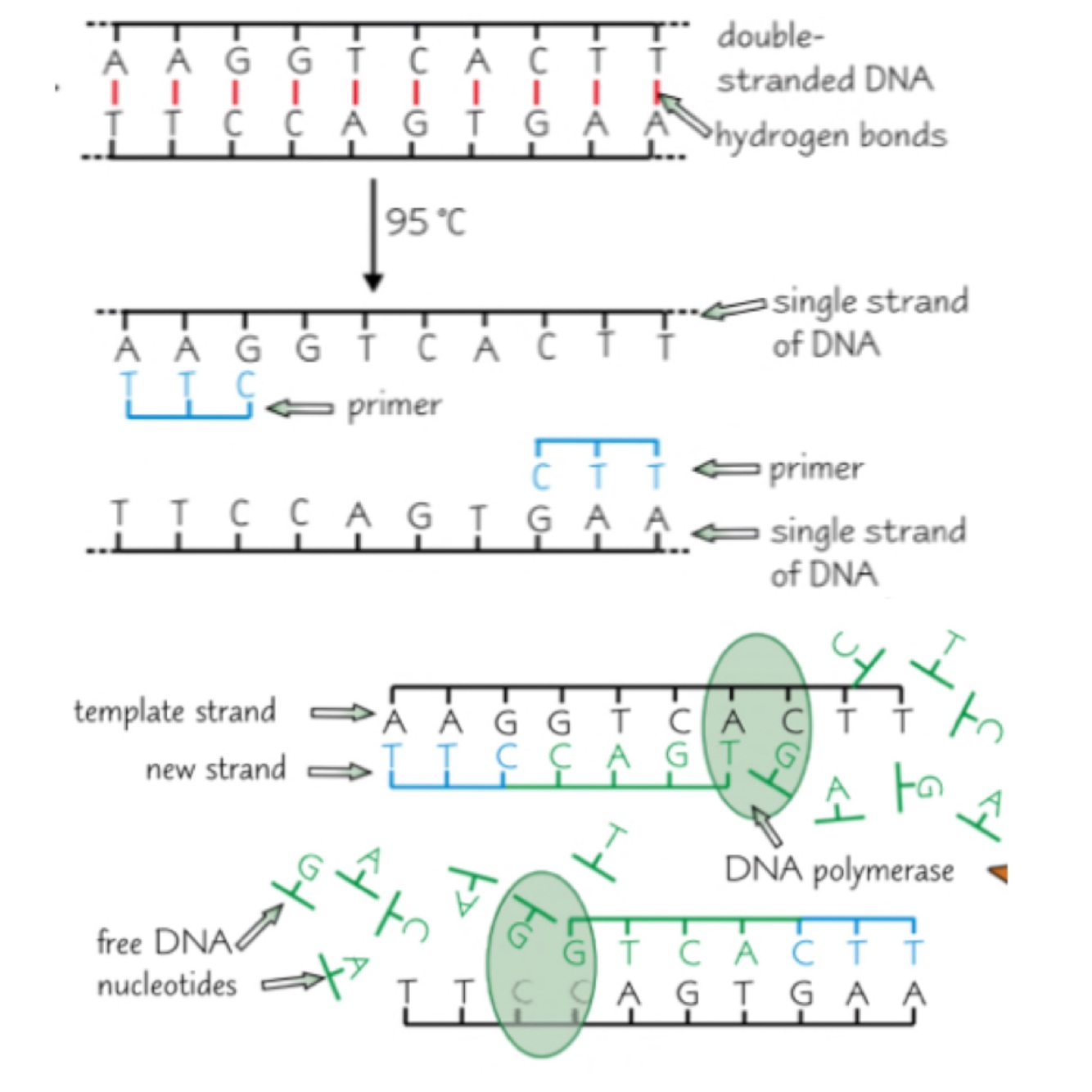 The cycle starts again, with the mixture being heated to 95 °C and this time all four strands (two original and two new) are used as templates