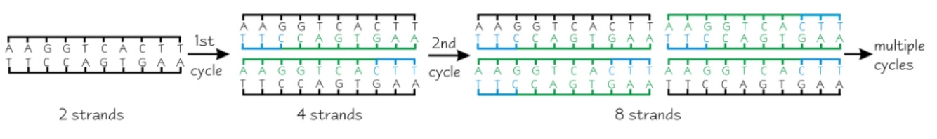 e.g. 1st cycle = 2 × 2 = 4 DNA fragments, 2nd cycle = 4 × 2 = 8 DNA fragments, 3rd cycle = 8 × 2 = 16 DNA fragments