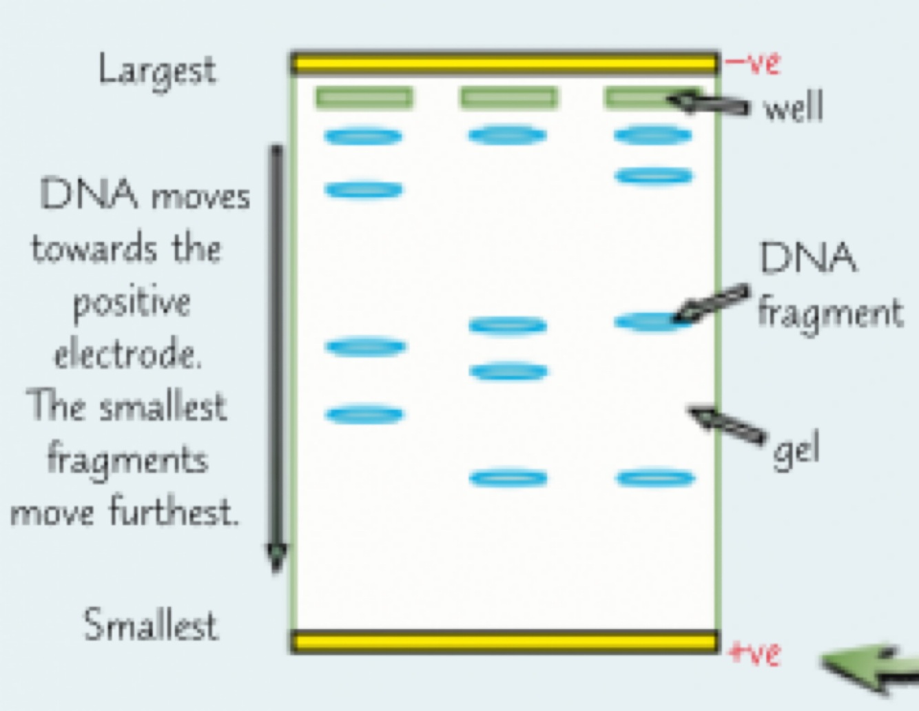 DNA fragments are negatively charged so they’ll move through the gel towards positive electrode at far end of the gel (anode)