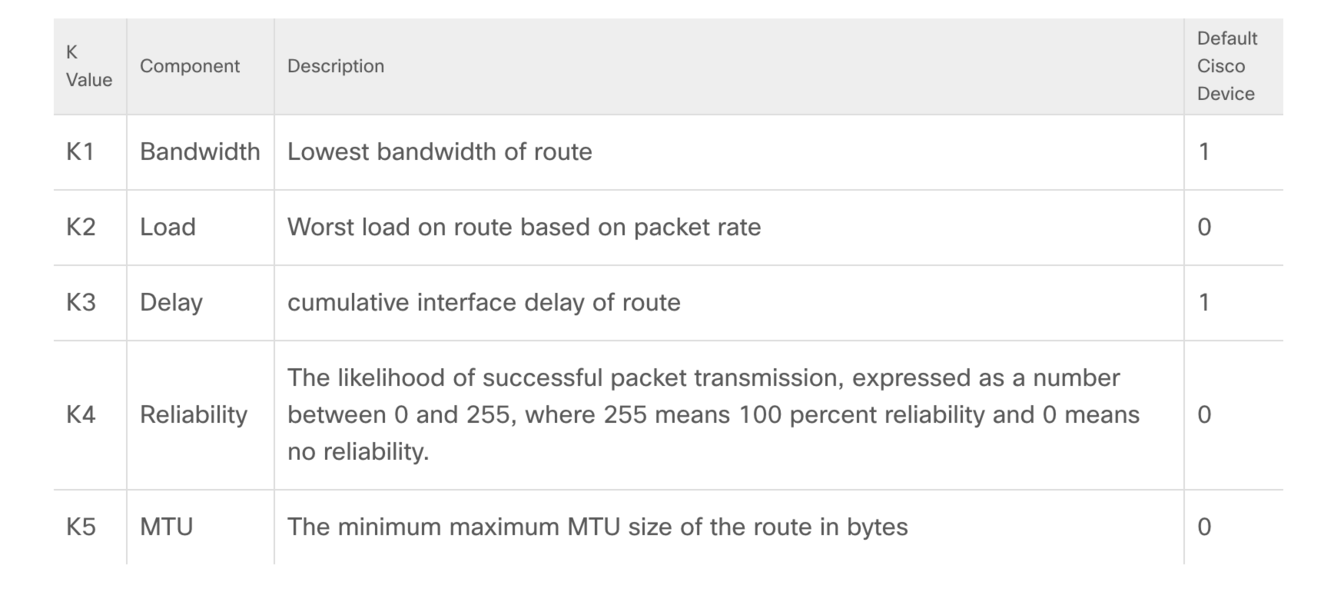 Unlike RIP or OSPF which use one attribute to determine metric, EIGRP uses a composite metric of 5 values: