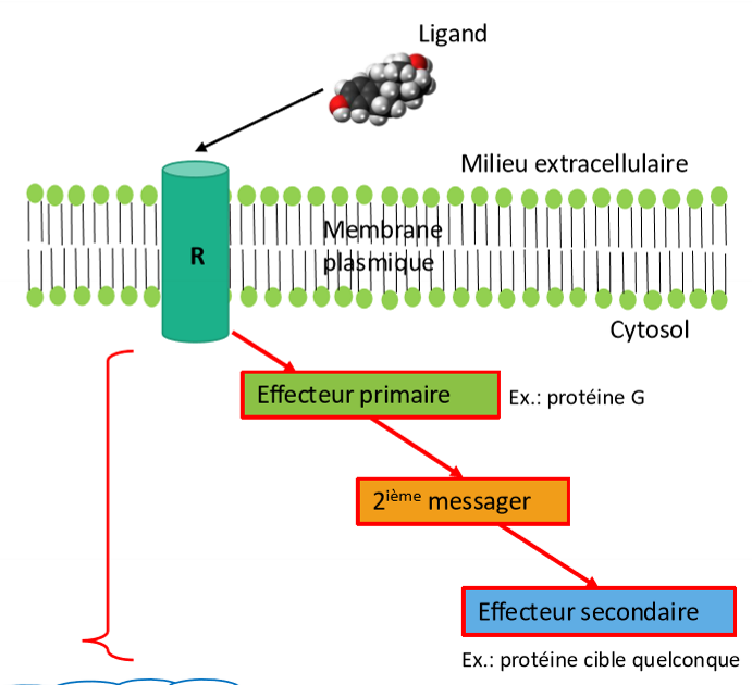Ligand - récepteur (R) - effecteur primaire (souvent protéine G ou kinéase) - un ou des messagers secondaires - effecteur secondaire