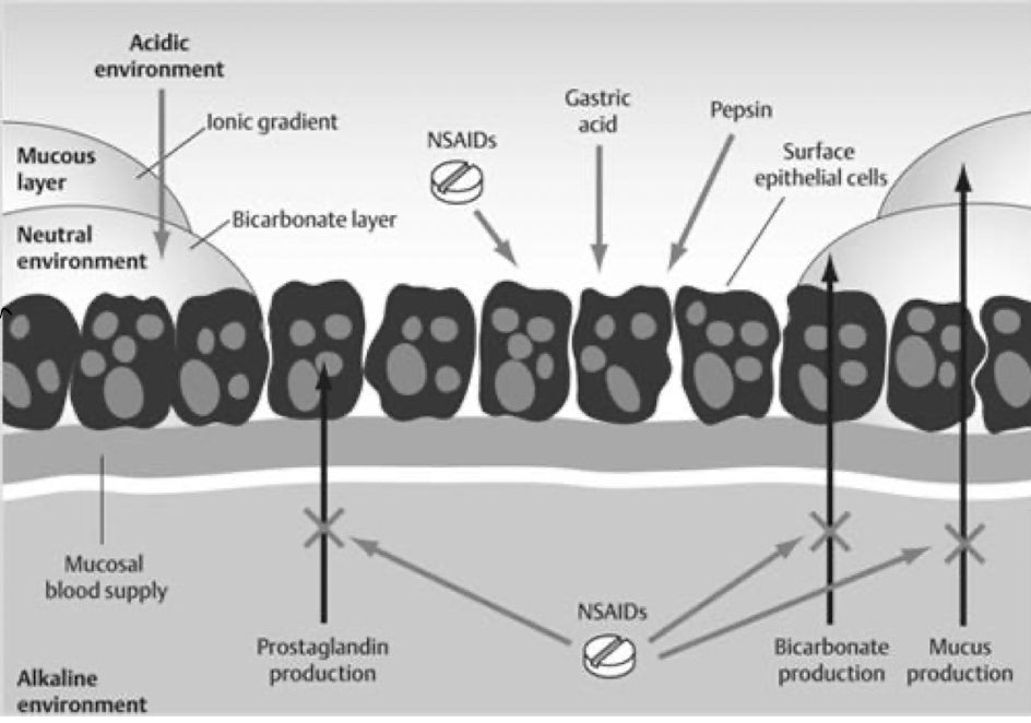 describe the pathophysiology behind the effects of NSAIDs for the development of peptic ulcers