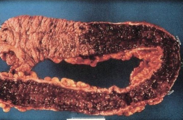 usually beginning in the rectum, the ulceration spreads in a continuous manner