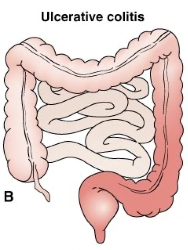 what are the regions of the bowel affected and the nature of the inflammatory process for ulcerative colitis?