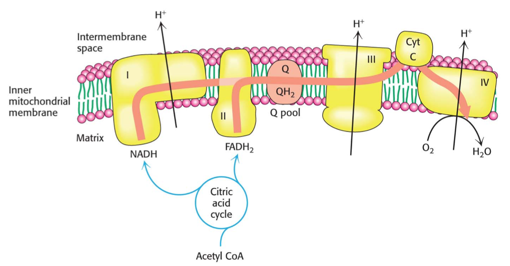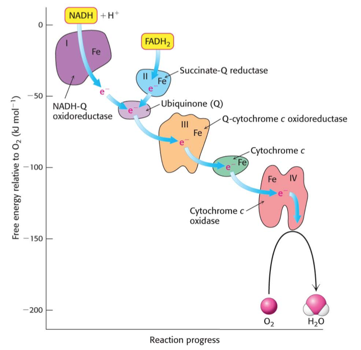 the electrons from NADH or FADH2 do not flow directly to oxygen but rather go through a number of intermediate carriers. How many complexes are involved from NADH to O2?