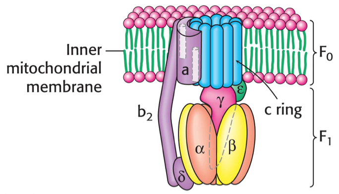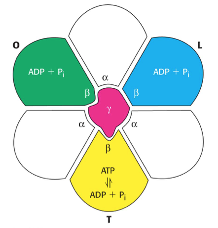 and ε subunits. This rotation causes conformational changes of the a/β ring which is where ATP synthesis occurs (specifically the β-subunit).