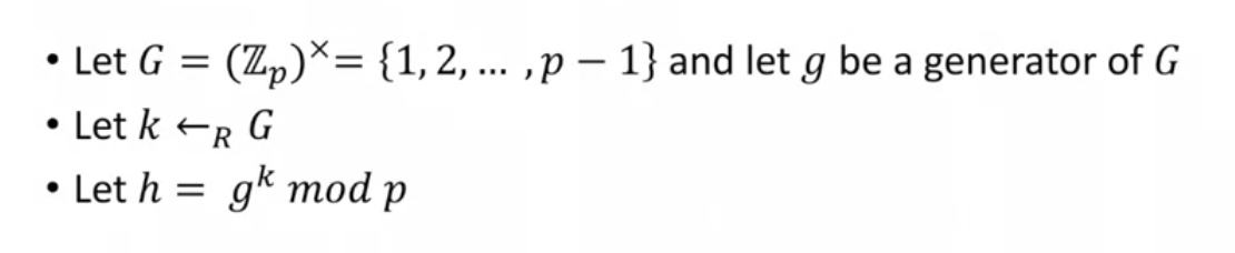Let p be a very large prime and g be a generator of the group. We have this group; the group of integers mod p in the multiplicative subgroup. We’re going to sample the seed of the PRG by just sampling an element uniformly from this group.