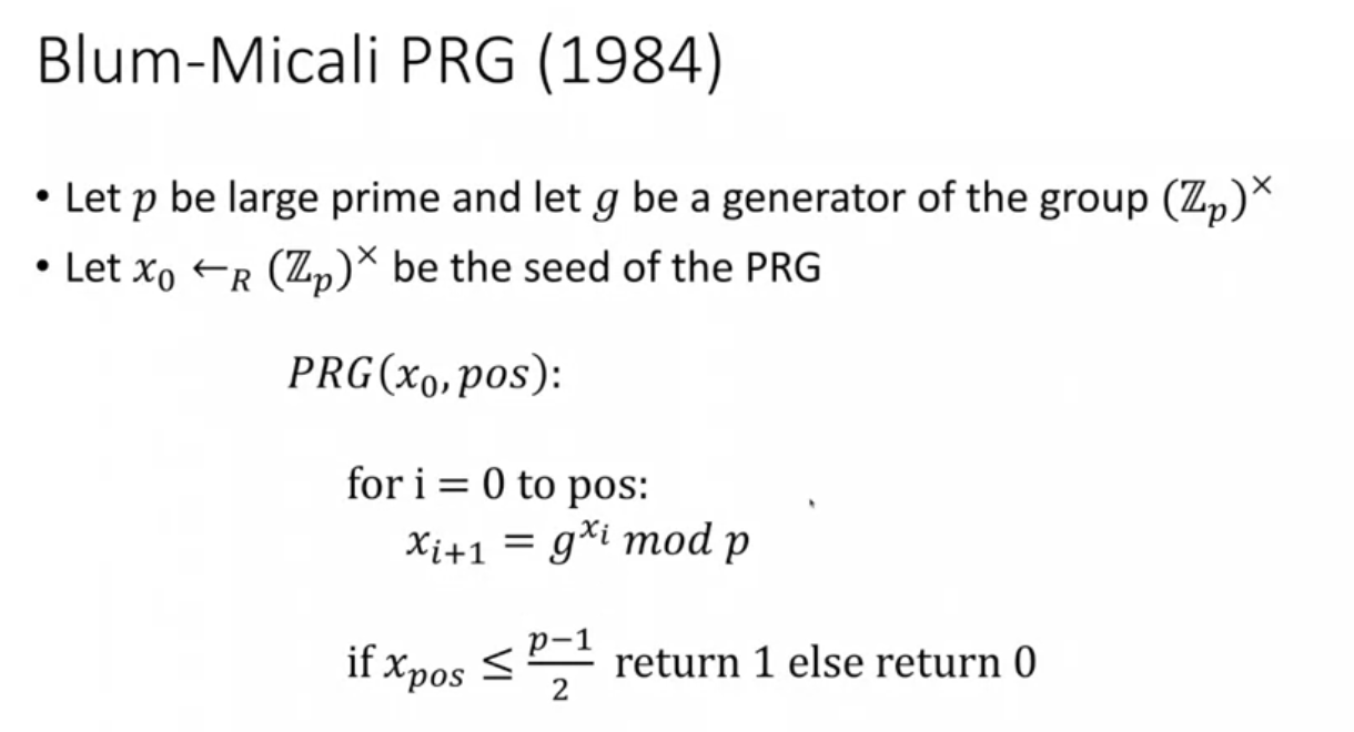 The way it works is that it basically goes from zero to whatever position you’re asking for. It basically takes the generator of the group and it raises it to x_i. So x_i is going to be initially x_0, so which is the seed mod p, and remember the seed is uniform, is chosen uniformly, which means this g^x_i mod p is going to be uniform in all the elements in the group. Which means this x_i plus 1 is going to be uniformly at random from the elements in the group. You’re going to repeat this operation position times. Once you’re done, what you’re going to say is if the value that you got after doing this position times is less than or equal to p minus 1/2, then return one, otherwise return zero. You’re going to return one bit, which is either one or zero. The idea is that because the output of doing this g^xi is going to be uniformly random if the exponent is uniformly random, and we’re doing this a bunch of times, then the final result x_pos has equal probability of being 1, or 2, or 3, or 4, or 5, or 6, or 7, or p/2 or p minus 1/2, it has equal probability to be any element in the group. Therefore, you have equal probability of getting a one or a zero. What Blum-Micali show, and I’m not going to go into this in this video because its way outside the scope of this video, is that if the discrete logarithm problem is hard, so if the assumption holds, then this pseudorandom generator then I’m showing you here, is secure. In the sense that an adversary won’t be able to predict the next bit with non-negligible probability or none negligible advantage.