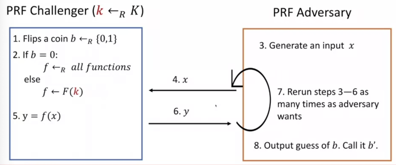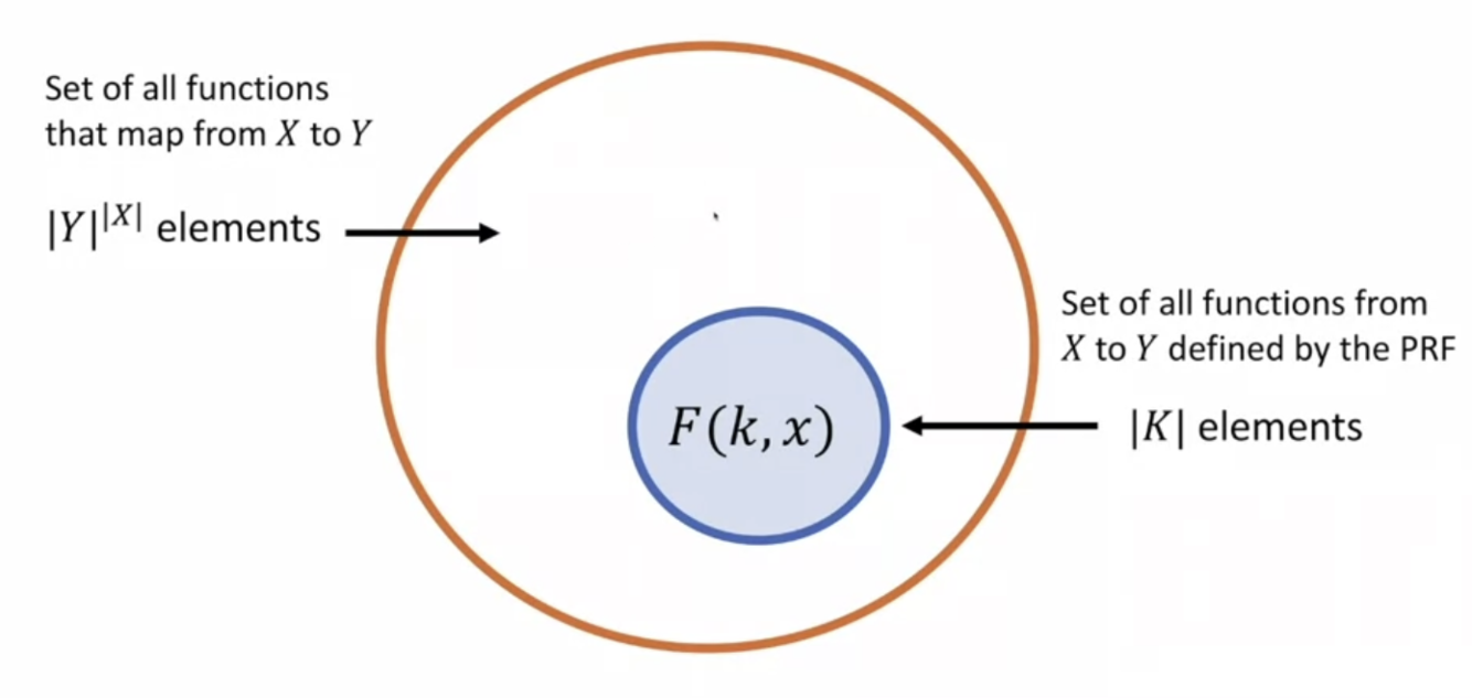 A PRF F is secure if a random function from the PRF family is computationally indistinguishable from random function from X to Y (random oracle)
