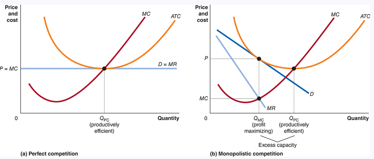 Monopolistic Competition: excess capacity because not producing at minimum ATC. Marginal benefit to consumer (D) > MC so some loss of efficiency.