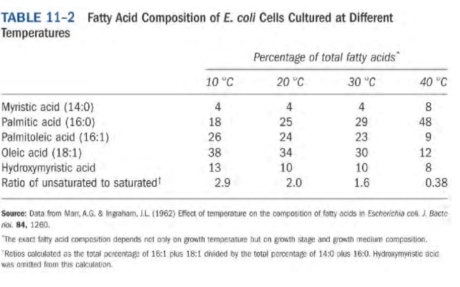 what is the table of examples of temperature-dependent changes to membrane composition