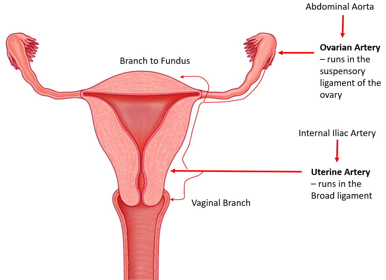 Uterine artery: Branch of the internal iliac artery. Forms an anastomoses with the ovarian artery