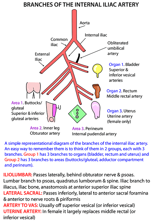 Identify the main branches of the internal iliac artery.