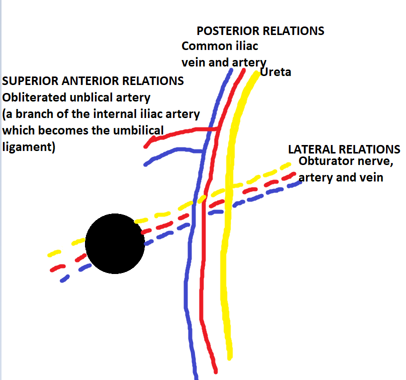 Anterior superior relations: Obliterated umbilical artery (from the internal iliac artery, becomes the medial umbilical ligament)