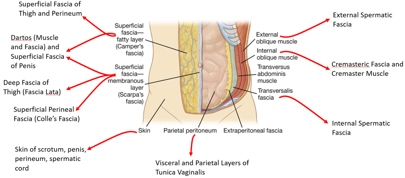 Scarpa’s (membranous) ▻ Dartos Fascia (penis) ▻ Colle’s fascia (urogenital triangle)