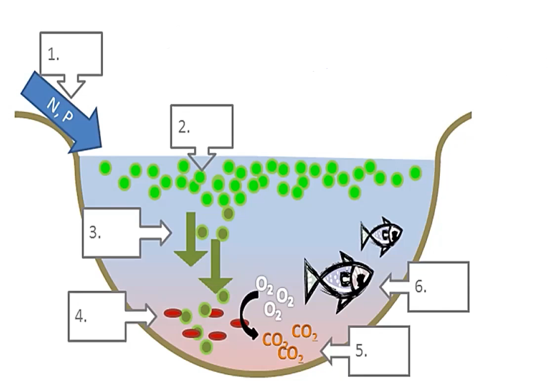 in the process of eutrophication, which step involves the production of oxygen?