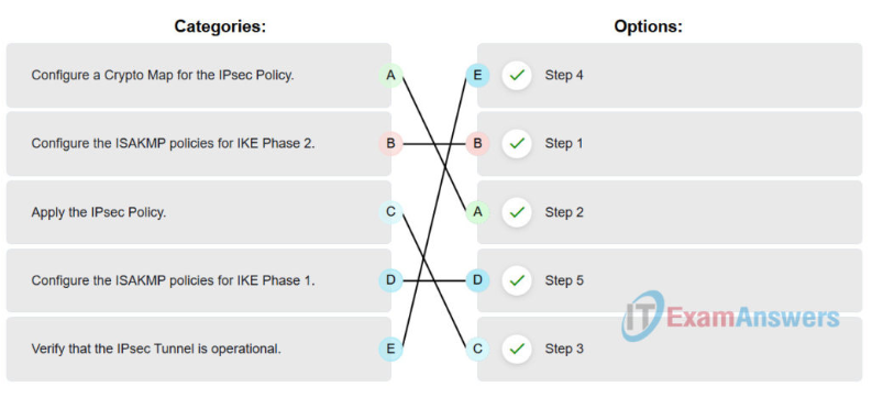 A site-to-site IPsec VPN is to be configured. Place the configuration steps in order.