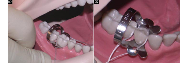 consist of two blades engaging the cervical margin of the tooth and joined by a connector of springy steel ( the bow)