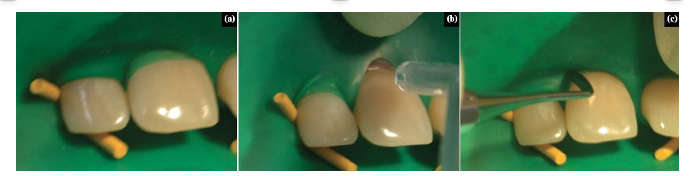 The operator stretches the dam away from the tooth whilst the assistant directs a stream of cold air from the triple syringe onto the mucosa. With the use of a flat plastic instrument the margin of the rubber dam may be tucked into the gingival crevice, providing a tight seal.