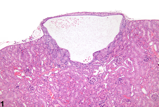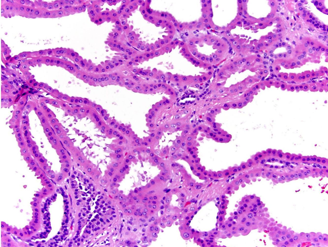 Dilated tubule with a low cuboidal or flattened pink epithelial lining. Usually unilocular. If multilocular, septa divind the cysts should be unremarkaable stroma with no epithelial islands or nodules.