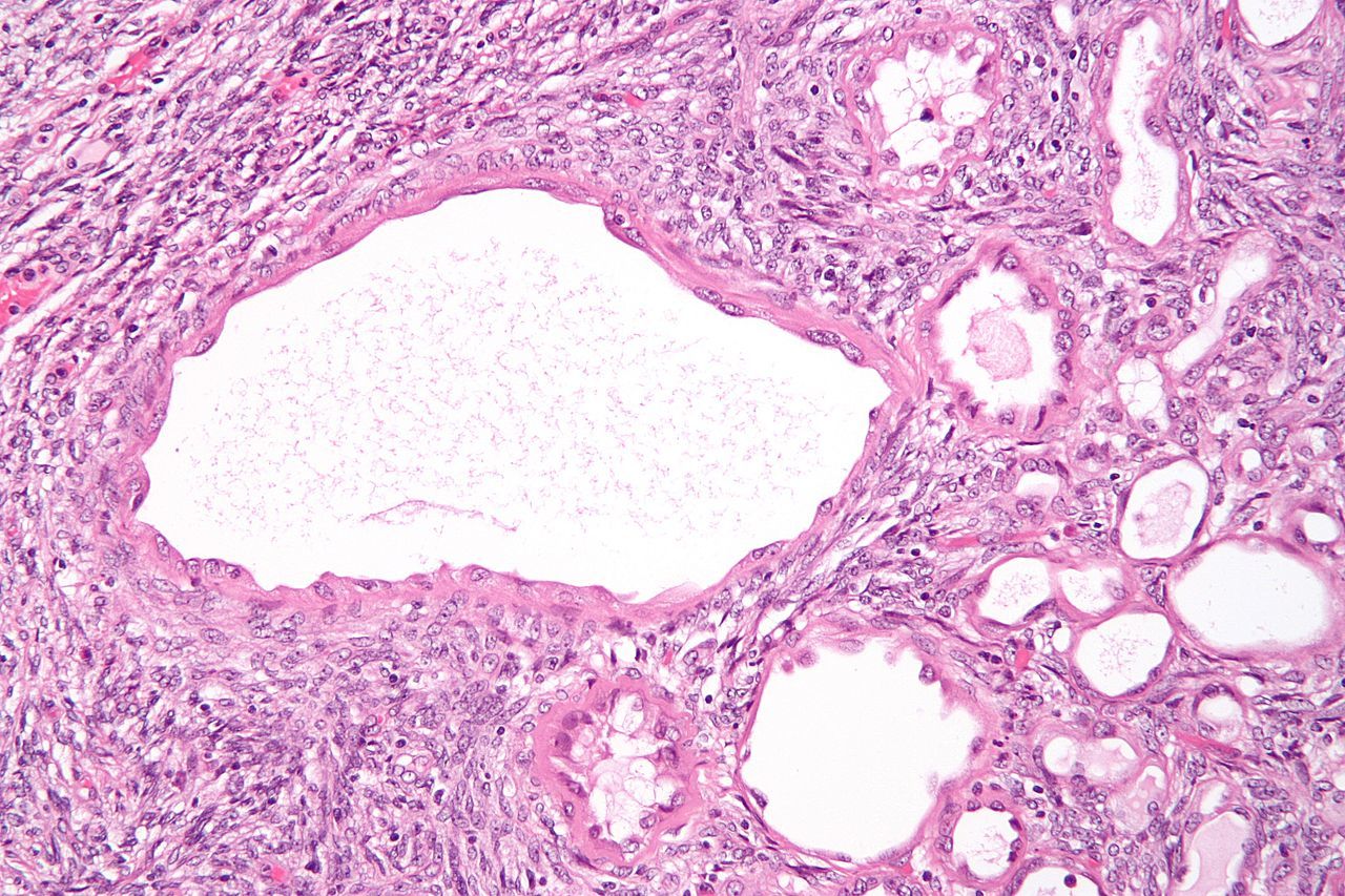 In adults, “cystic nephroma” means “one of those ectopic-ovarian-stroma-lesions mainly found in women.” It is related to the mixed epithelial and stromal tumor (MEST).