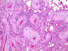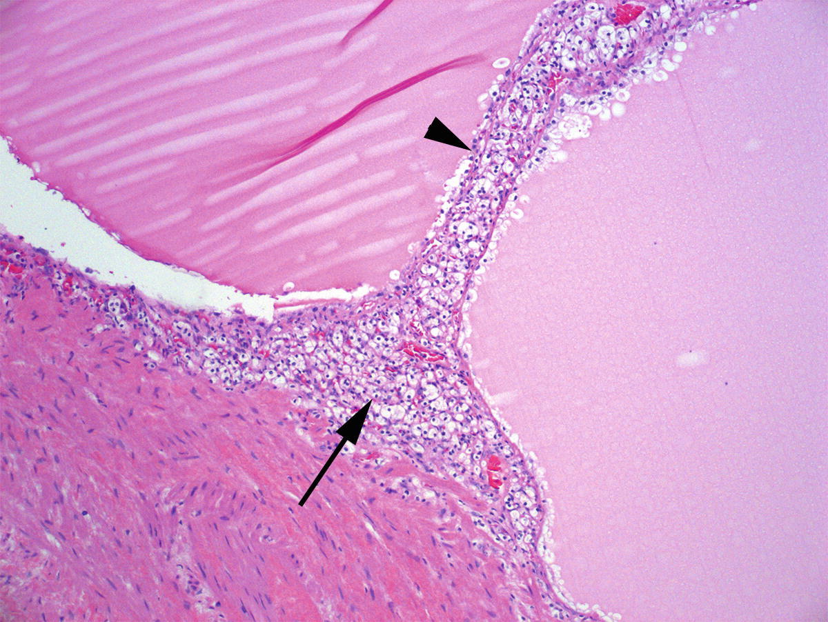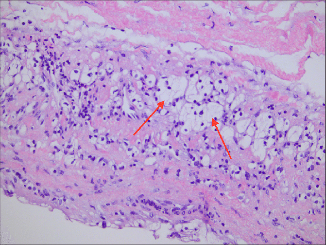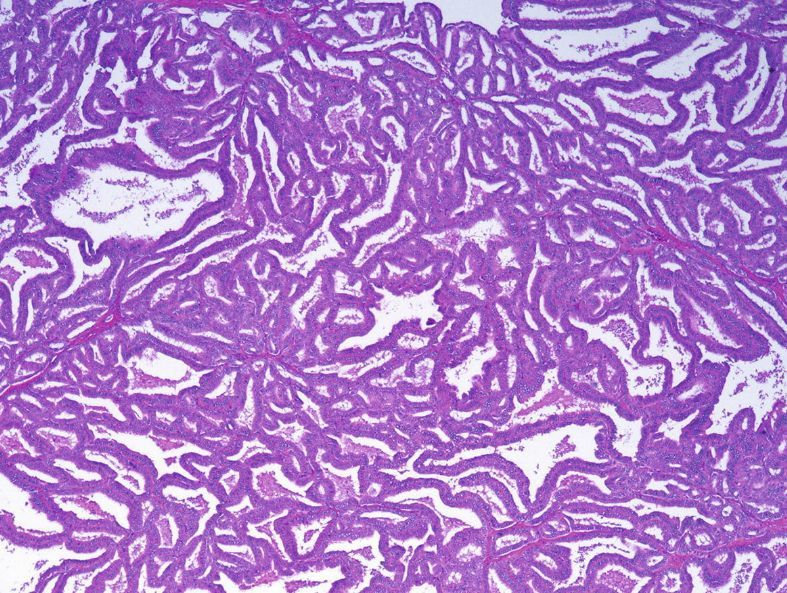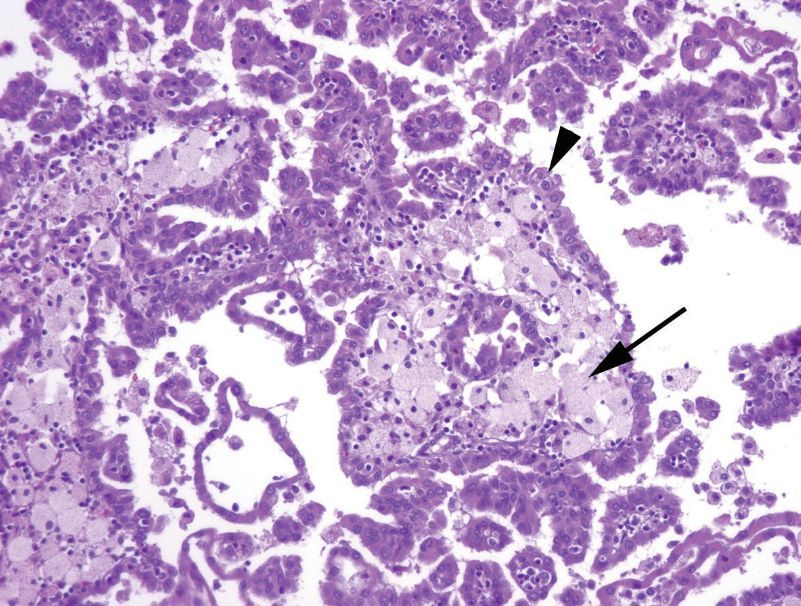 The classic histologic pattern is that of a fibrovascular core packed with foamy macrophages and lined by cuboidal cells with round nuclei. This image is pathognomonic. Psamomma bodies, hemosiderin-laden macrophages, and focal clear cells may also be seen.