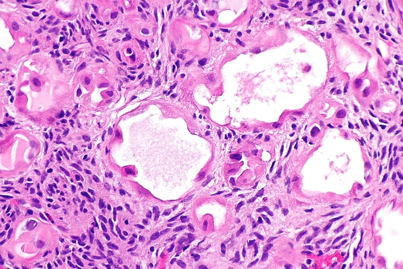Found in end-stage kidneys. An unmistakable grungy mix of oncocytic cells and bubbly, microcystic architecture with hemorrhage, necrosis, and oxalate crystals.