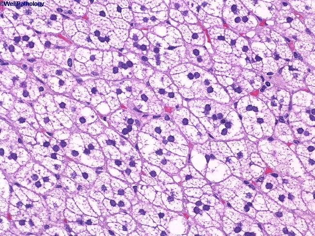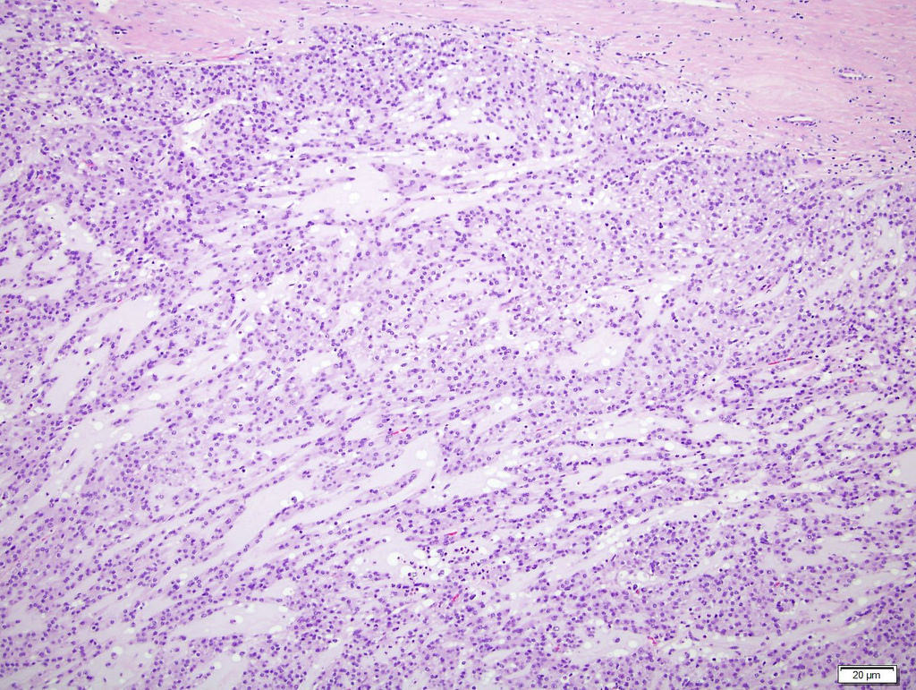 The architecture is that of arrays of narrow tubules. It is made up of clear pale cells with indistinct cell boundaries that may fuse into spindle cell areas. Nuclei are small, round, pale, and sometimes with pinpoint nucleoli.