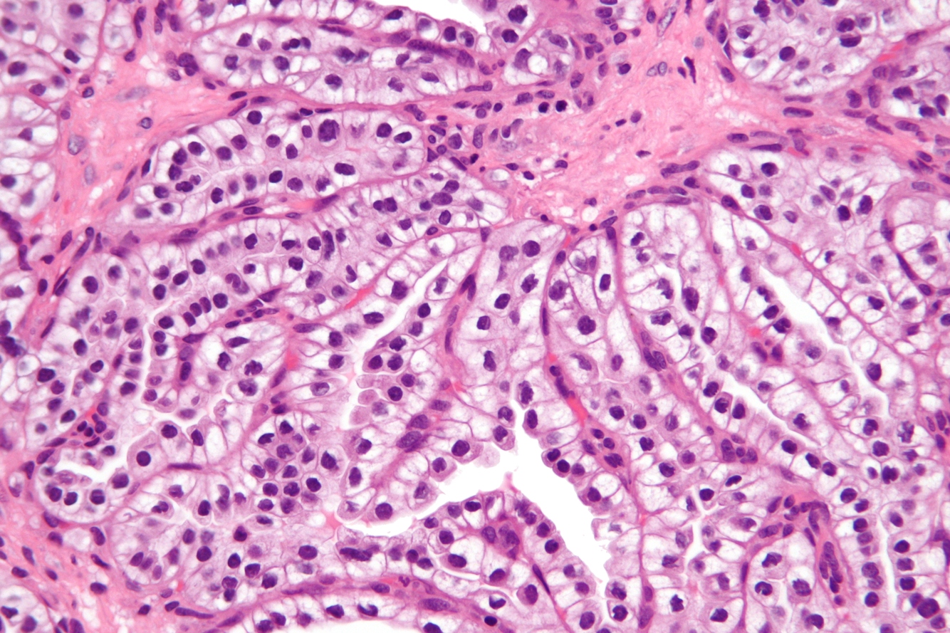 Low-grade clear cell neoplasm with a papillary or tubular architecture. Features include clear cells with small, dense, dark nuclei, cells arrarnged on delicate fibrovascular cores or packed into tight tubules, and may show cystic degeneration. Tumors are often small and well-circumscribed or encapsulated.