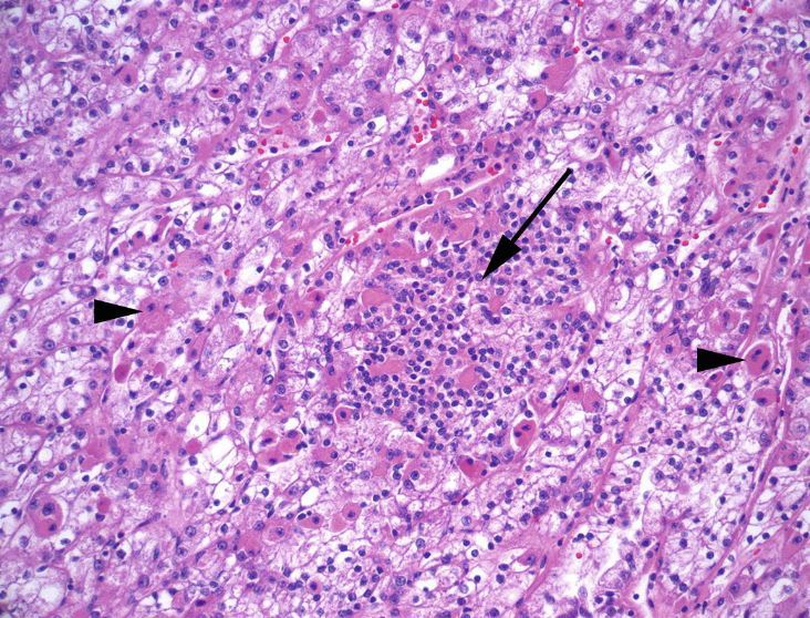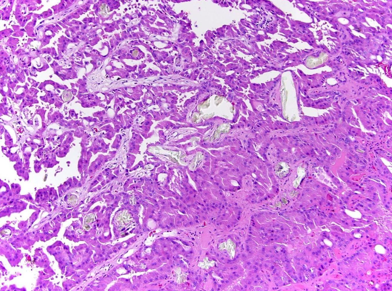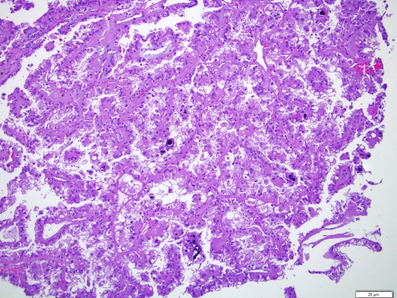 Pale pink under the microscope with a perinuclear clearing. May be a “feathery” pink or an oncocytic pink. It is not encapsulated and grows as a solid or papillary mass. Cell membranes are distinct and there may be occasional binucleated cells.