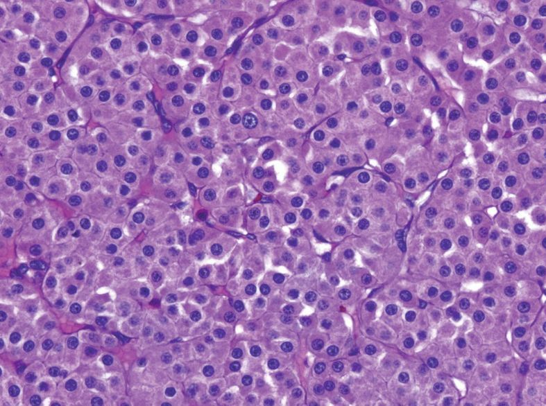 Cellular tumor of pink-to-blue cells that may be arranged in papillary formation, solid sheets, or trabecular cords.