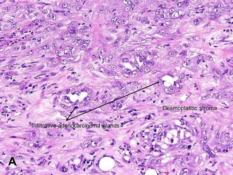 A high-grade tumor that arises from the renal medulla. It looks and acts like an adenocarcinoma. The cytology is clearly malignant and there is a strong desmoplatic response. It may stain for mucin and CEA.