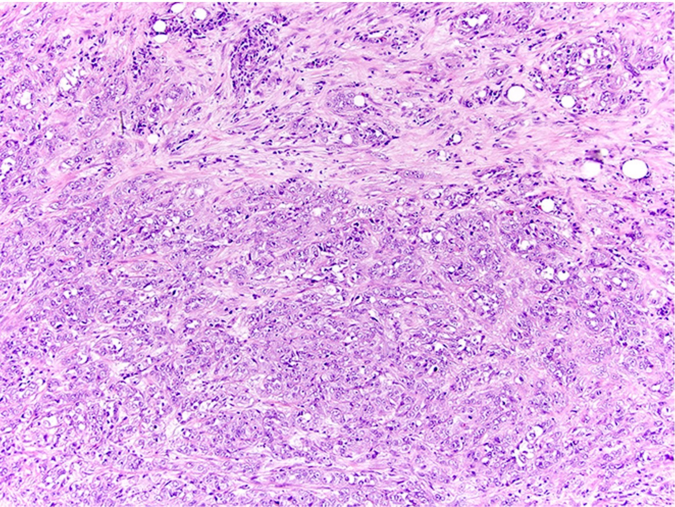 Oddly, this carcinoma stains positive for HMB-45, Melan-A, but not keratin or S100, which can lead to confusion for an epithelioid myelolipoma.