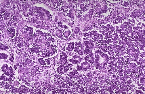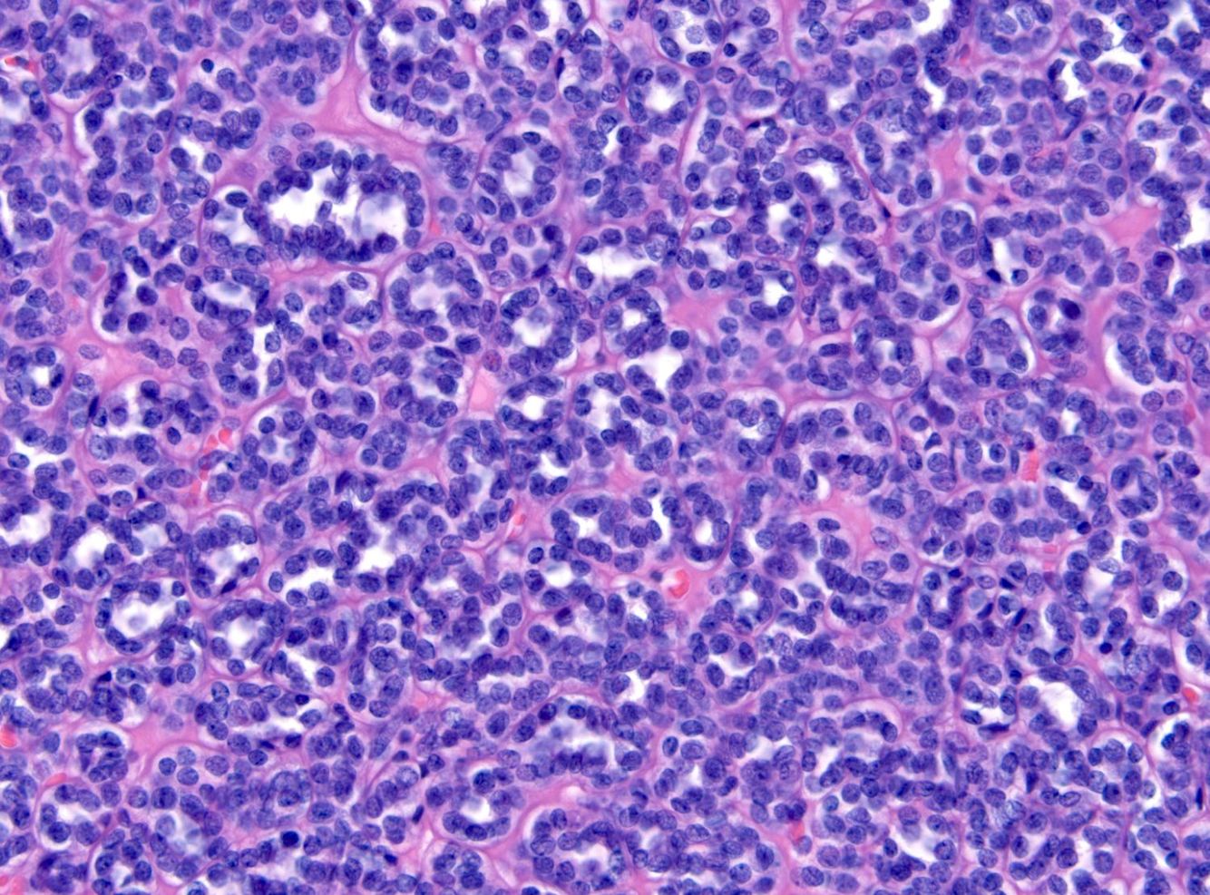 Usually a 1x diagnosis. It is circumscribed but non-encapsulated tumor of monotonous, small, tightly-packed, dense blue cells with little or no cytoplasm.