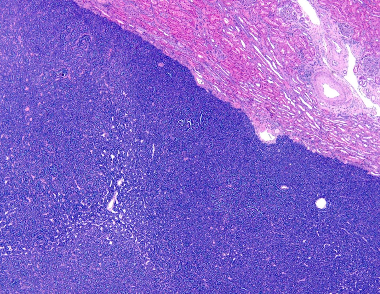 One of the two main “blue cell” lesions of the kidney (the other being Wilm’s tumor). Thankfully, this one is benign. In fact, it may be effectively a Wilm’s tumor that differentiated/matured.