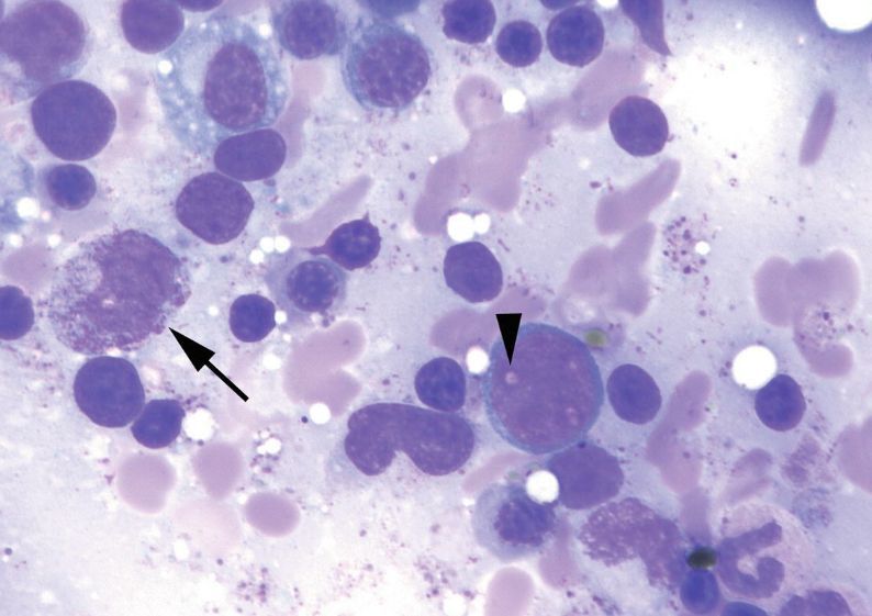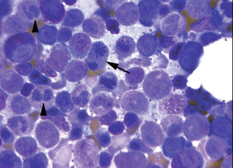 The blast nucleus is large and round with very finely textured chromatin and a nonstaining nucleolus that shows up as a “hole” in the chromatin.