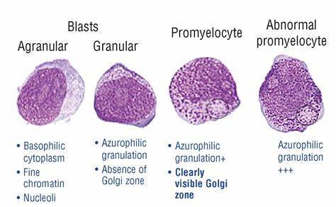 In normal, healthy blasts, nucleoli can look lighter, almost like punched-out holes.