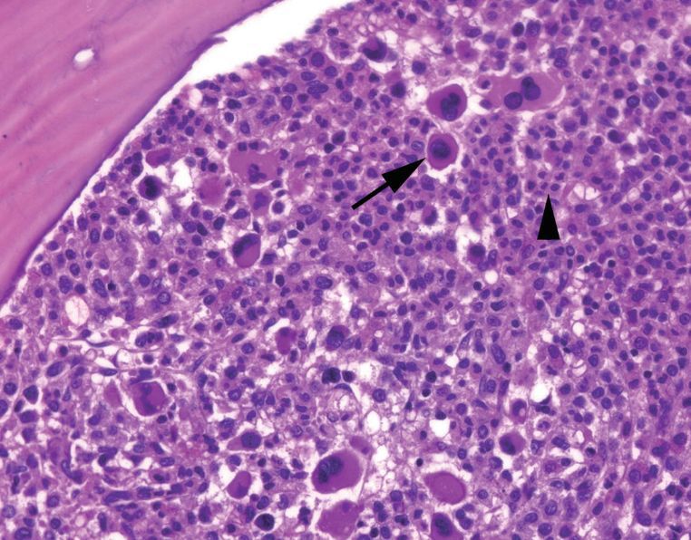 The marrow is hypercellular and full of small, hypolobated megakaryoytes and mature neutrophils