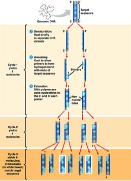 Denature DNA with heat, add primer (which binds to the two strands). Replicates until you get as much as you need.