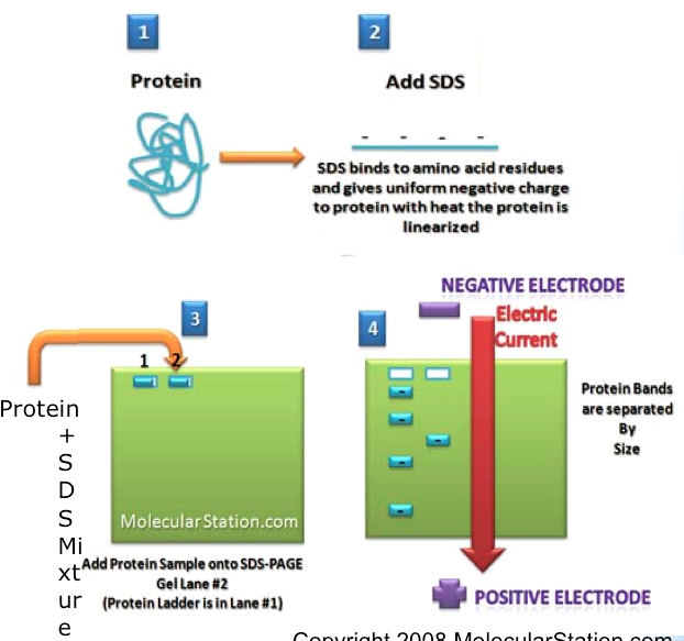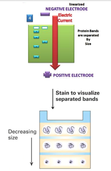 Proteins are treated with an ionic detergent (SDS) that denatures & unwinds them, and coats them with a negative charge