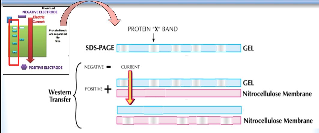 Proteins run on SDS PAGE are transferred to nitrocellulose membrane via current