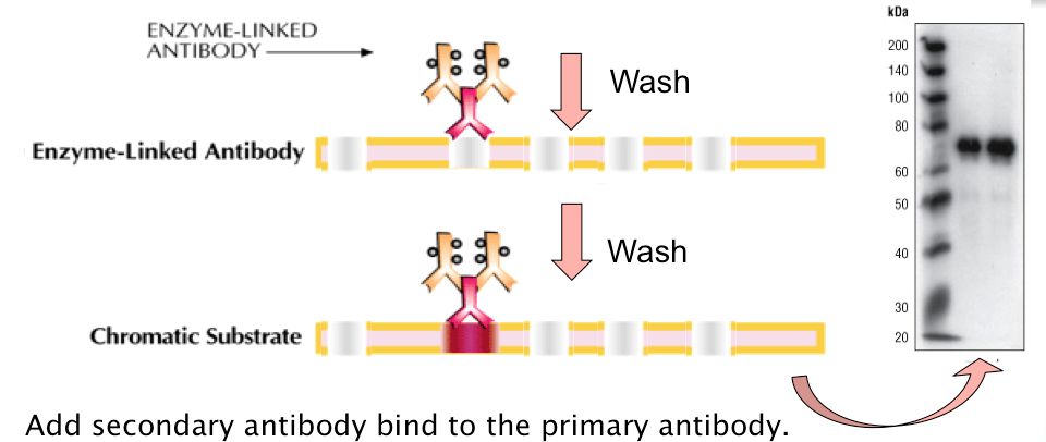 Secondary antibody has a luciferase reporter and cleaves luciferin which generates light and is detected using film (which is the black band)